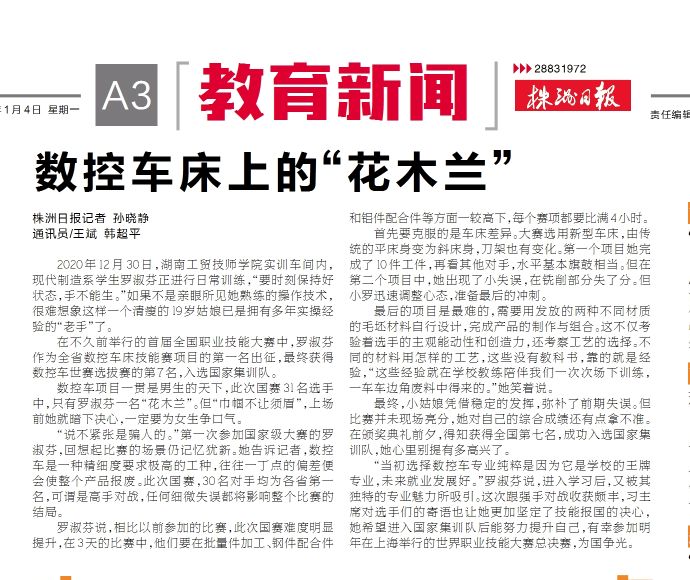 “当初选择数控车专业纯粹是因为它是学校的王牌专业,未来就业发展好。”罗淑芬说,进入学习后,又被其独特的专业魅力所吸引。这次跟强手对战收获颇丰,习主席对选手们的寄语也让她更加坚定了技能报国的决心,她希望进入国家集训队后能努力提升自己,有幸参加明年在上海举行的世界职业技能大赛总决赛,为国争光。
