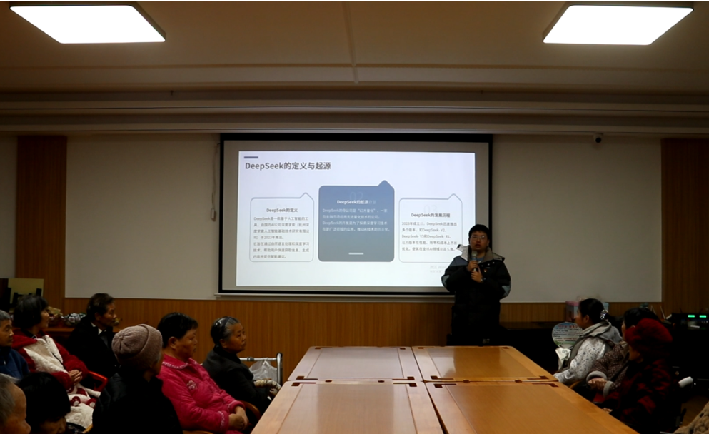 在温情互动的同时,师生团队依托电工专业特长,对养老院房间内进行插座、灯具等安全隐患排查,并协助整理院内环境。在劳动结束后,团总支书记周禹锡老师特别为老人和护工科普人工智能技术应用,通过演示DeepSeek模型,展示了“一键生成大字版新闻摘要”功能,帮助老人快速获取天气、节日等实用信息;护工们则体验了“智能营养搭配”服务,输入现有食材即可获得菜谱建议与营养分析。(电气工程系供稿)